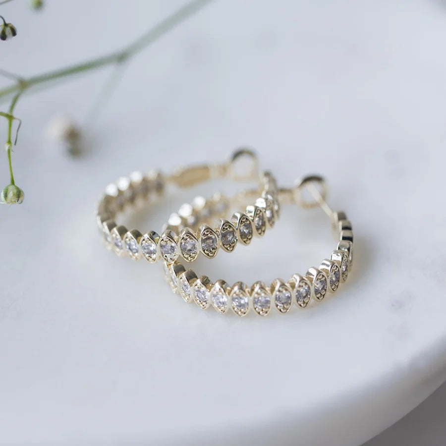 Front & Centre Hoop Earrings by Glee Jewelry. Gold or silver plated with clear cubic zirconia detail, approx. 1" diameter. Hypoallergenic, nickel/lead free, and antitarnish coated.