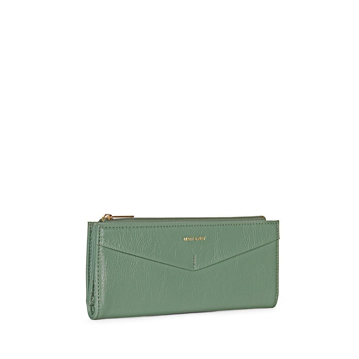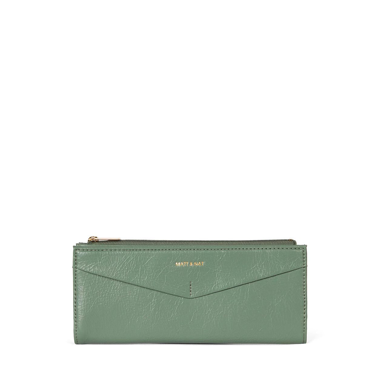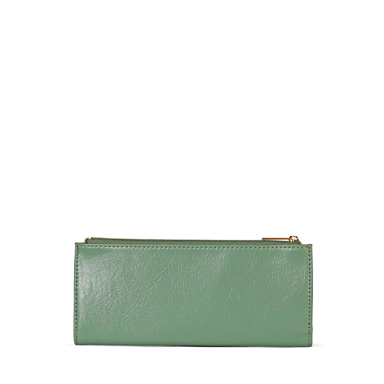 Folded wallet with a snap closure, zippered coin pocket, and card slots inside.