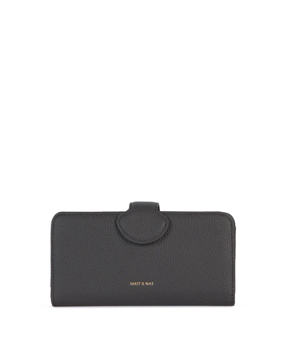 Folded wallet with a tab closure and a zipper pocket at the back.