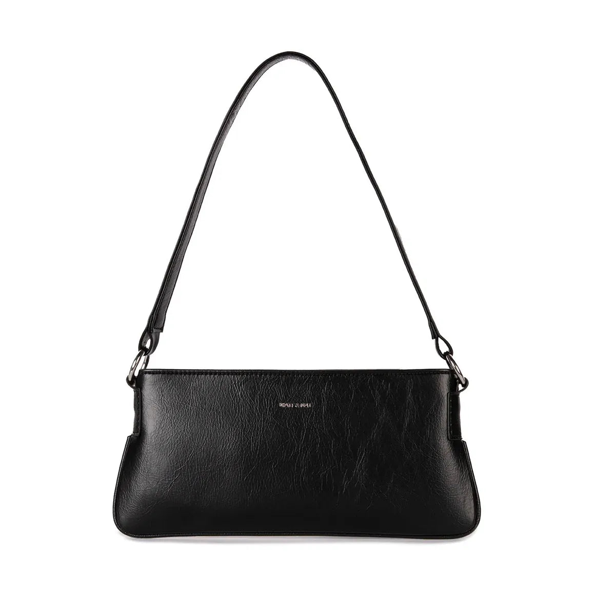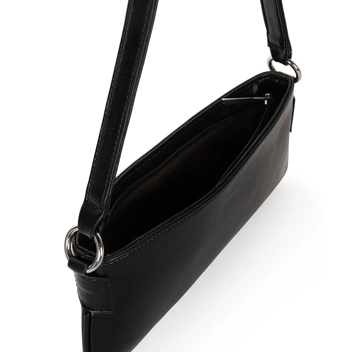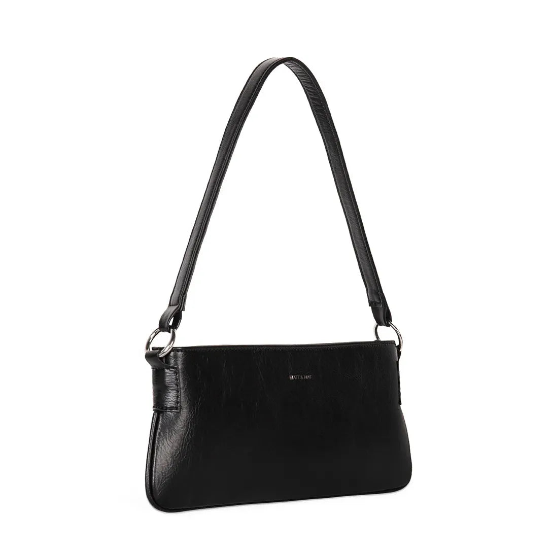 A minimalist slim shoulder bag with a top zipper closure.