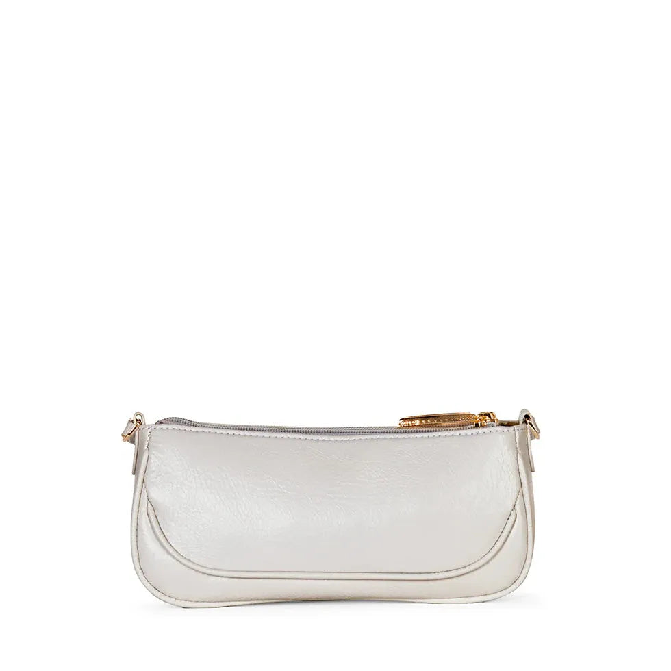 A small crossbody bag with two zippered compartments, piping details, and an adjustable strap.