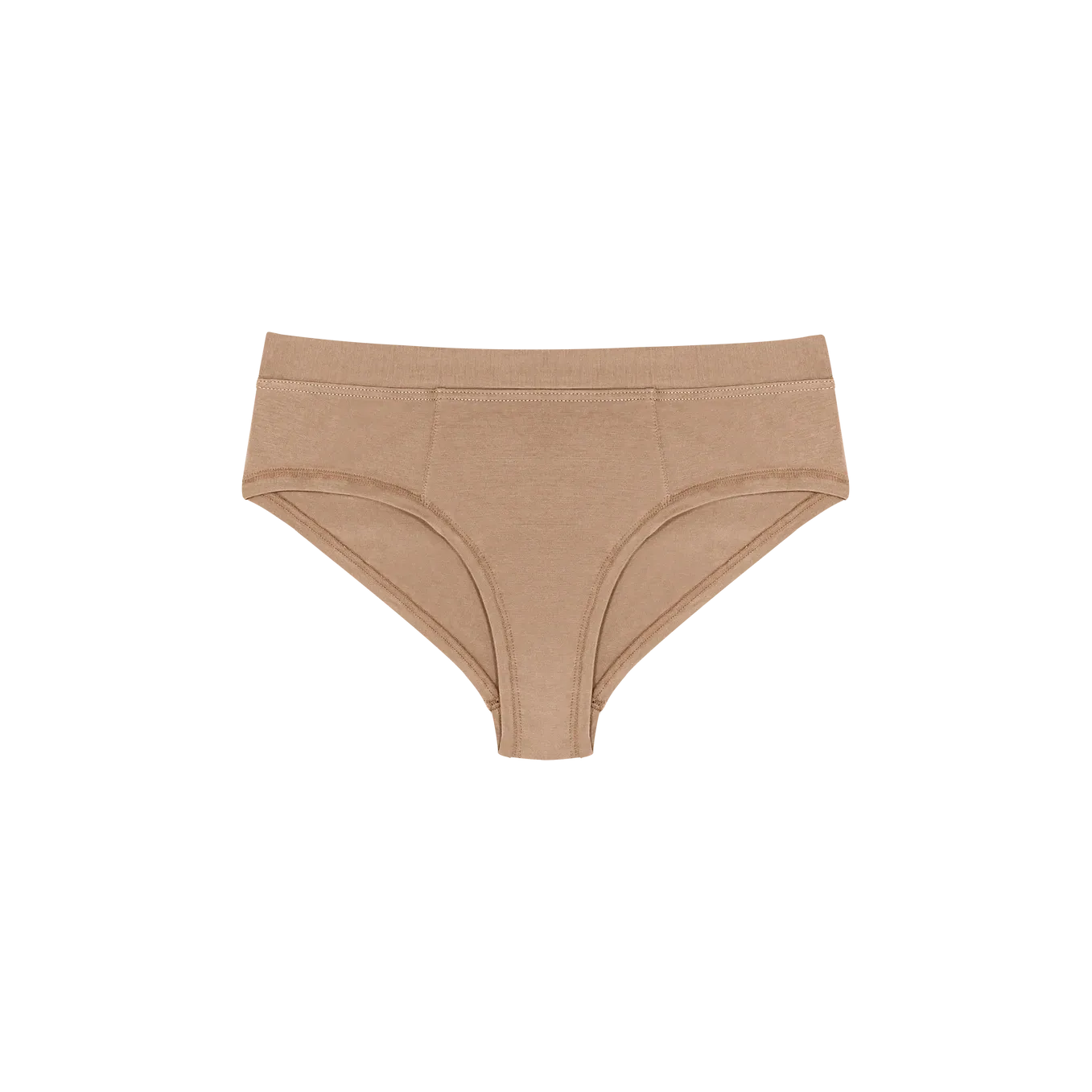 Our cheekiest style outside of a thong, this is a flattering, butt-contouring cut with half-cheek coverage. Soft yet structured, it stays put without digging in. The Cheeky has a low-mid rise with a deeper side, cuffed waistband, and visible front panel.