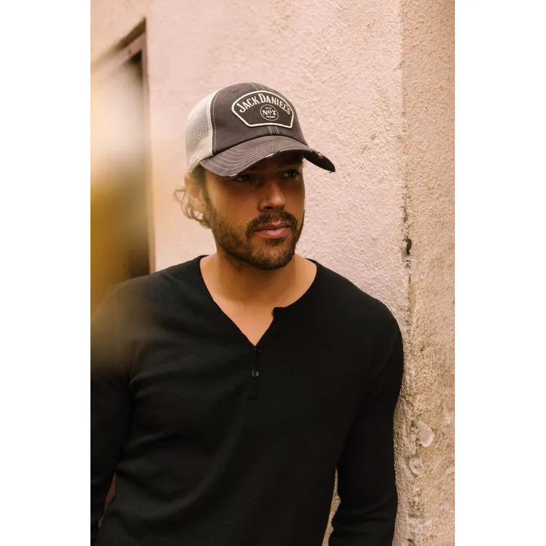 Pigment washed cotton twill cap with soft structured crown, soft mesh sides and back. Plastic snap back strap. Front logo is washed twill merrowed patch with embroidery and matte print details.