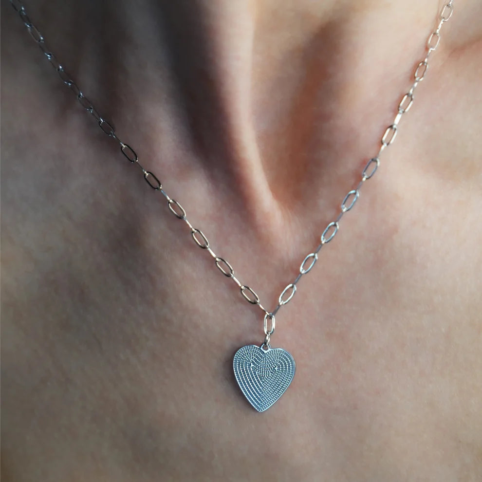 Introducing our Paper Clip Chain Necklace with Patterned Heart Charm – a sophisticated and charming accessory that seamlessly blends modern design with classic elegance.