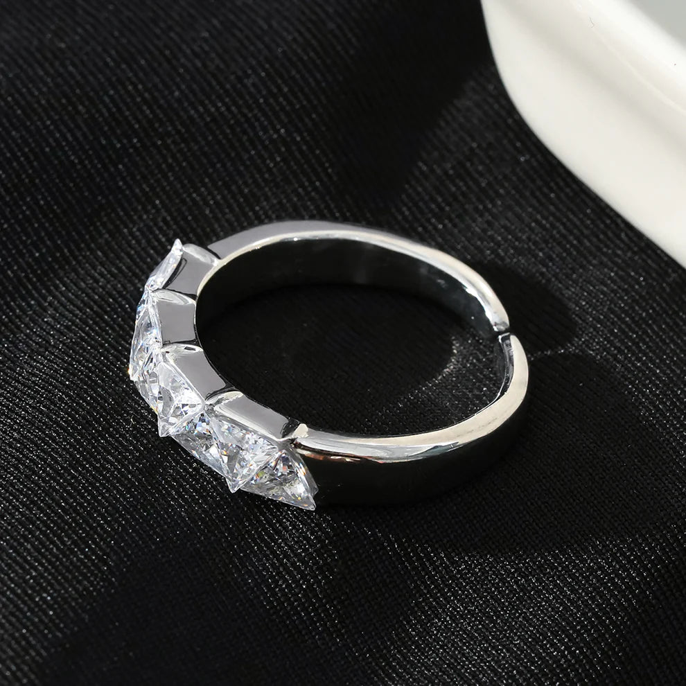 A stunning ring designed to captivate with its refined sparkle. This exquisite ring features a continuous row of shimmering zirconia gemstones, elegantly encased and set to cover the top half of the band. The stones catch the light from every angle, delivering a luxurious brilliance that rivals diamonds, minus the ethical and environmental issues associated with mined diamonds.