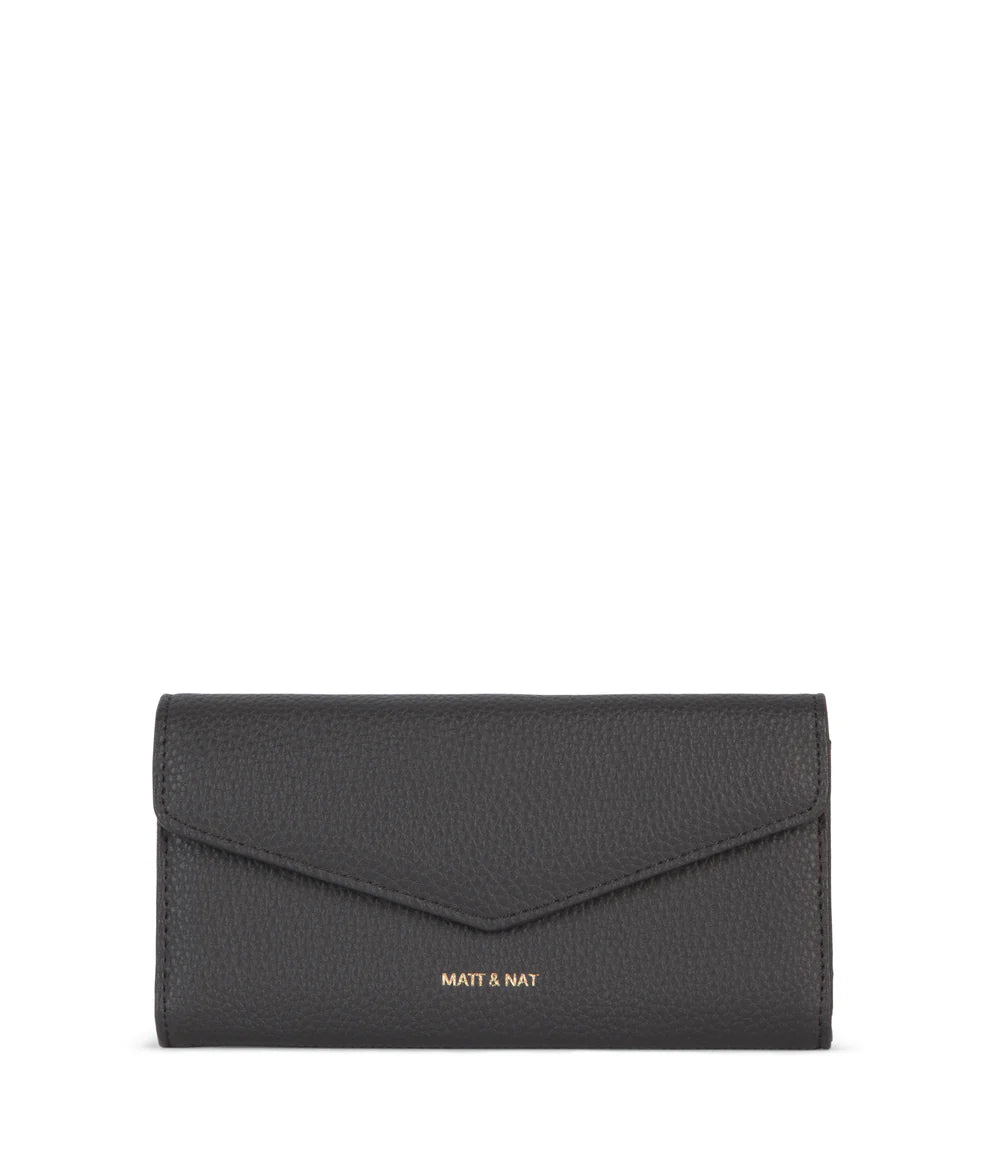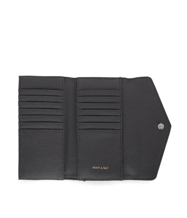 Folded wallet with a flap closure and a zipper pocket at the back.