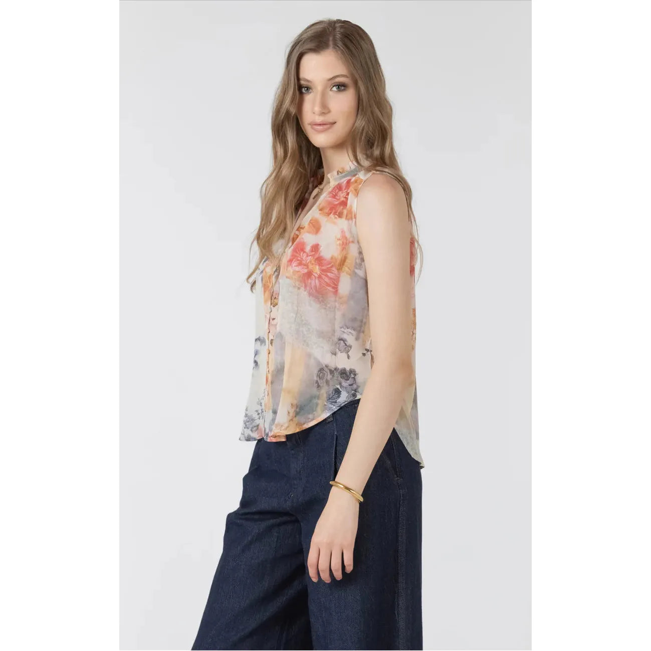 A semi-sheer sleeveless floral pattern blouse. Featuring subtle ruffle details at the neckline and matching fabric buttons.