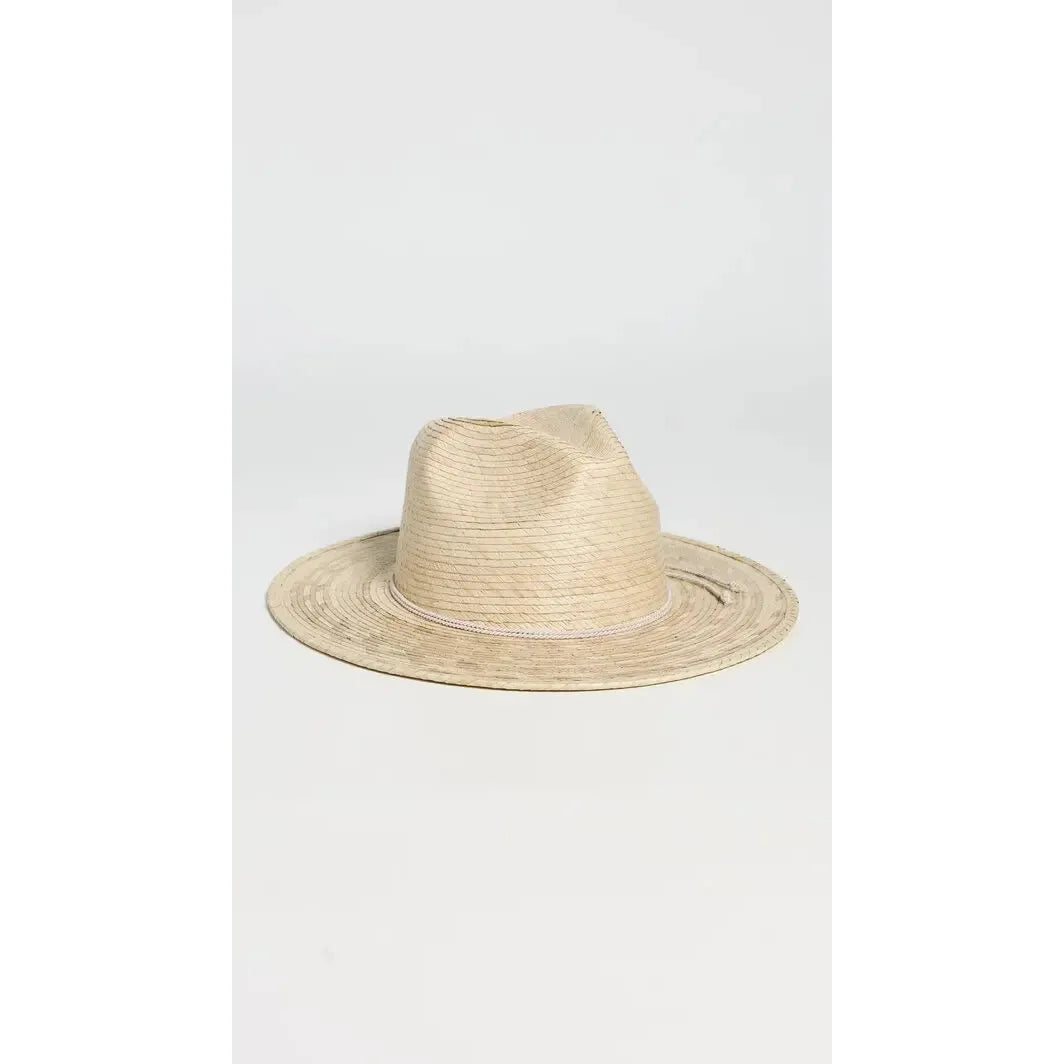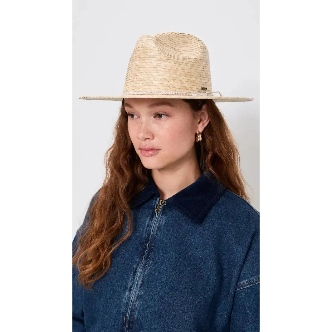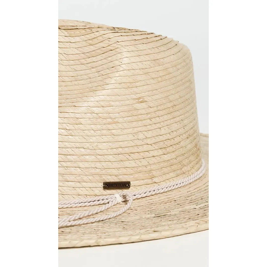 The Brixton Blake sun hat is a straw hat with a braided cord detail. The shell is 100% straw. Measurements from size S are: Brim 3.25in / 8cm, crown 5in / 13cm, circumference 22in / 56cm.