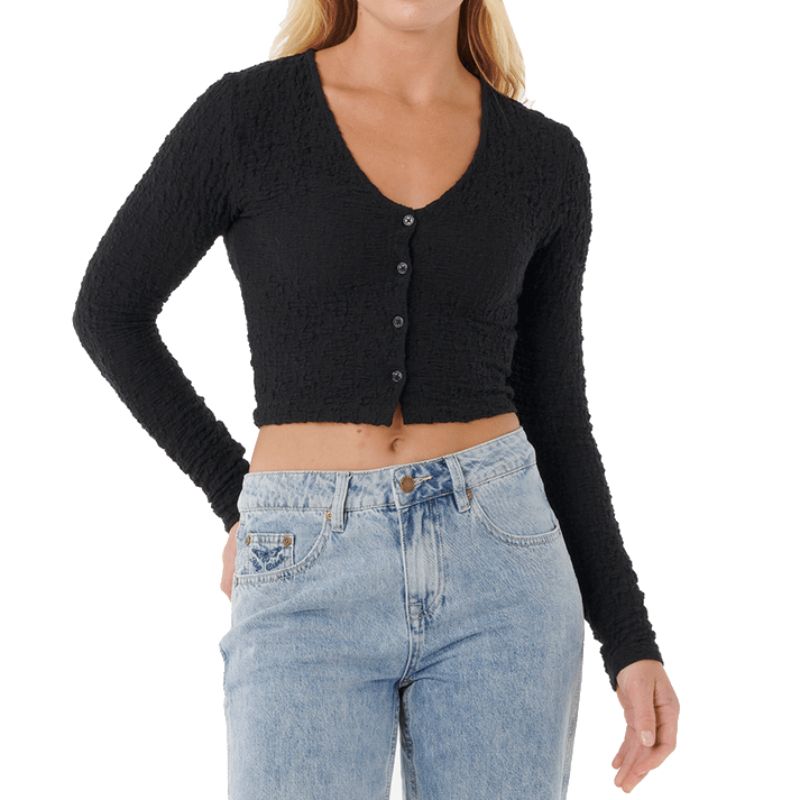 The Sunset Luau Texture Long Sleeve Tee is a fitted essential with subtle texture, contrast stitching, and a delicate button-up detail at the neckline. A go-to for layering post-surf or dressing up laid-back afternoons.