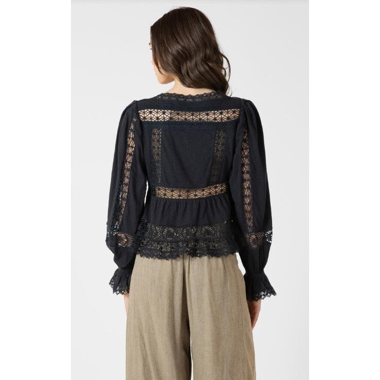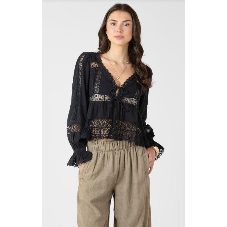 Dex offers a specific Mixed Fabric Lace Trim Top in black, designed to be a versatile and lightweight piece for layering or wearing on its own. This top features a delicate lace trim that adds a subtle, feminine touch to the design.