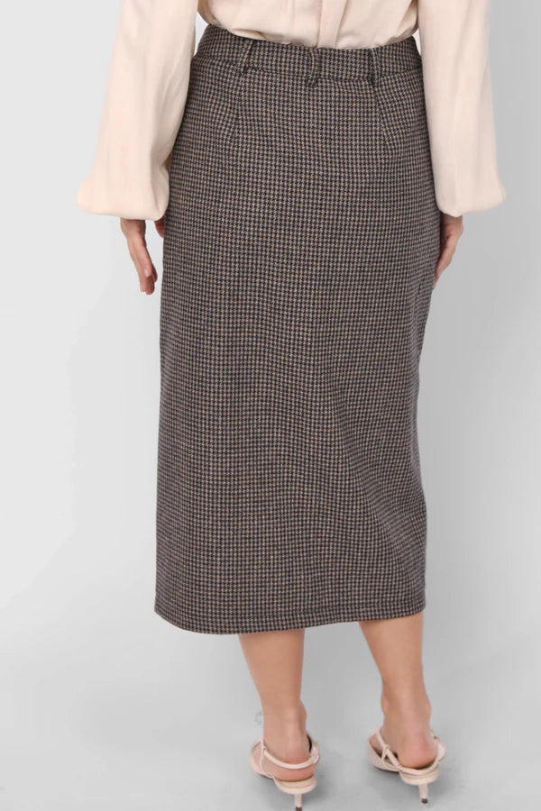 The Outta Here Houndstooth Midi Skirt by Sadie & Sage is a tailored, versatile piece featuring a classic houndstooth pattern, front slit, and practical pockets—perfect for both work and weekend wear. Try this out with the matching Outta Here Houndstooth Tailored Vest!