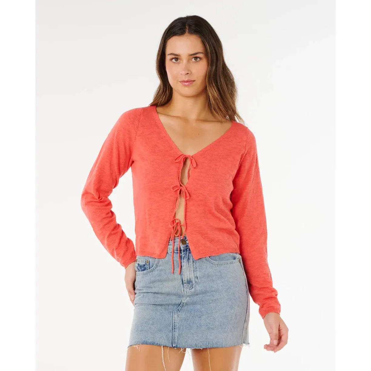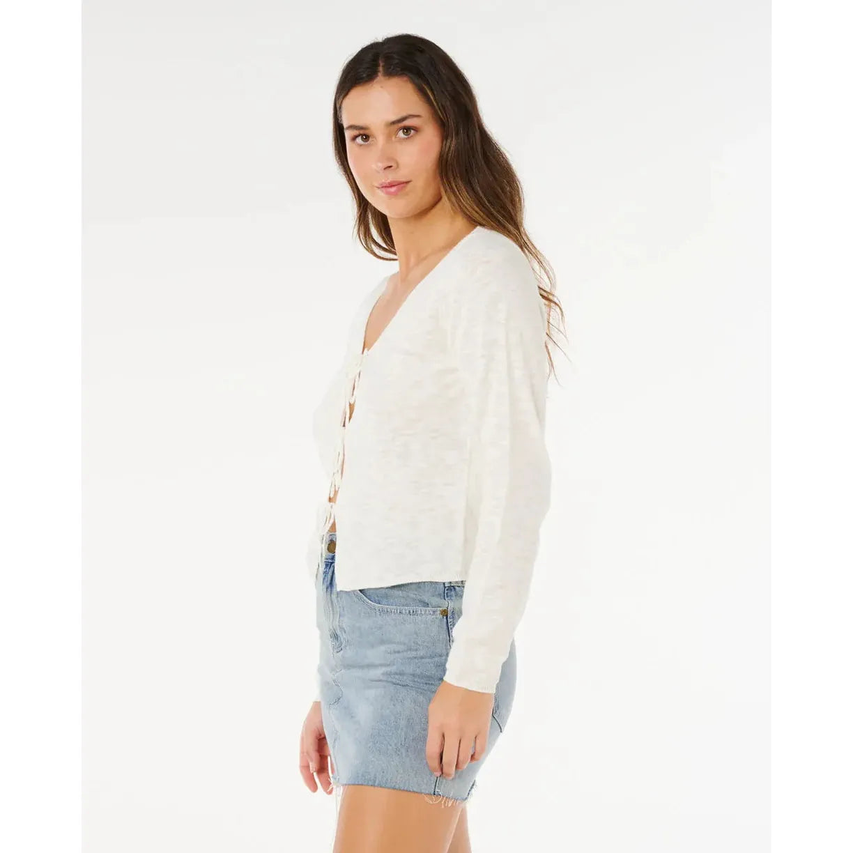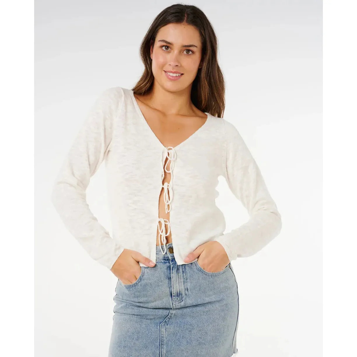 Layer up in the Pacific Knit Cardigan, a cropped design with long sleeves and a functional front tie, crafted from cotton wide rib for a surf-ready finish.