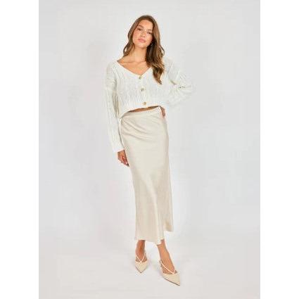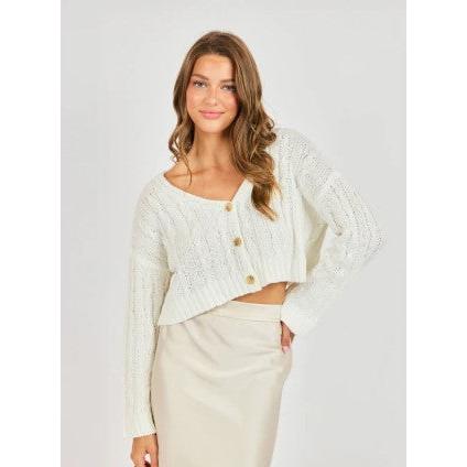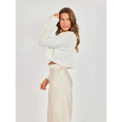 This charming white You And Me Cardi blends classic knit textures with a modern, flirty silhouette. Crafted from a soft knit, the relaxed airy fit makes it a perfect companion for high-waisted silks and satins.