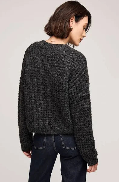 The Willow sweater is made of a lofty yarn in a waffle knit pattern. Features include a v-neckline with a wide rib and a slightly cropped length for easy layering.