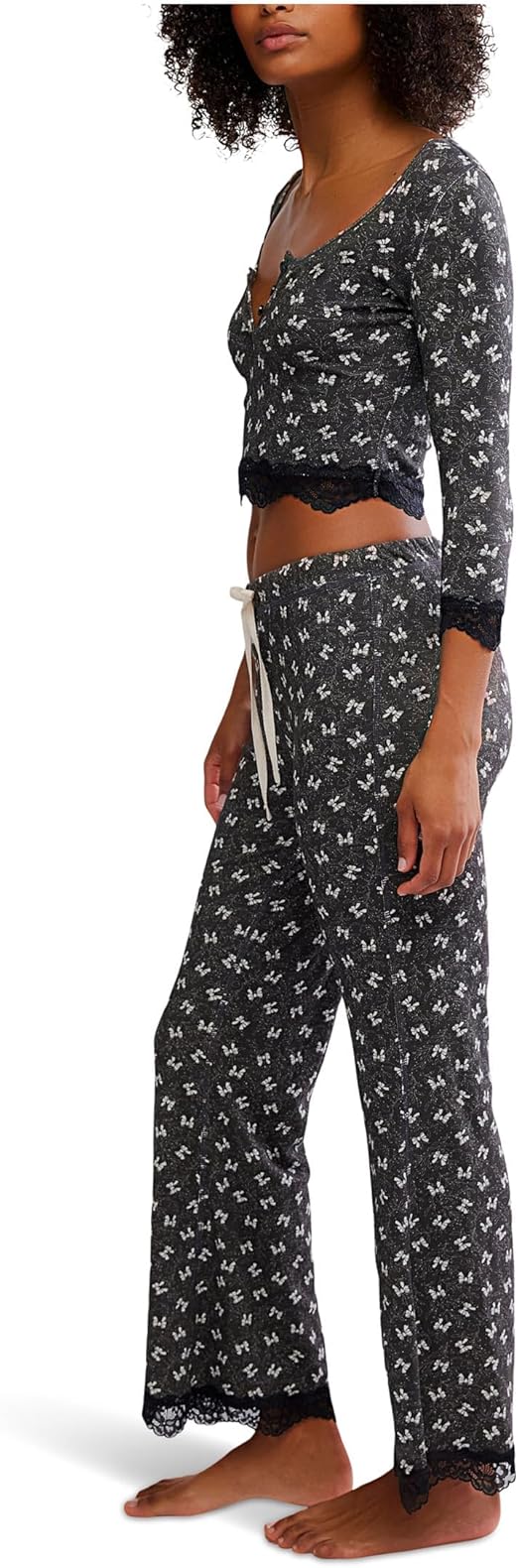 Two-piece pajama set with cropped top and flare-leg pants. Cotton-rayon blend with stretch for breathable, cozy comfort! Top features scoop neck, three-quarter sleeves, and button placket. Scalloped lace hem adds playful, feminine detail. Elastic waistband with drawstring ensures personalized fit. Perfect for lounging or sleeping in effortless style.