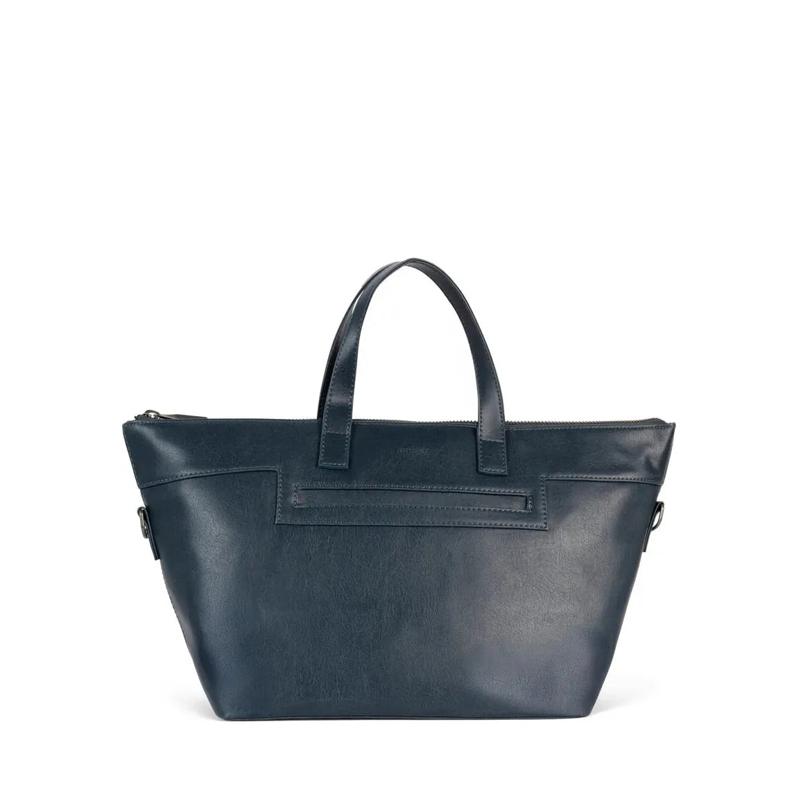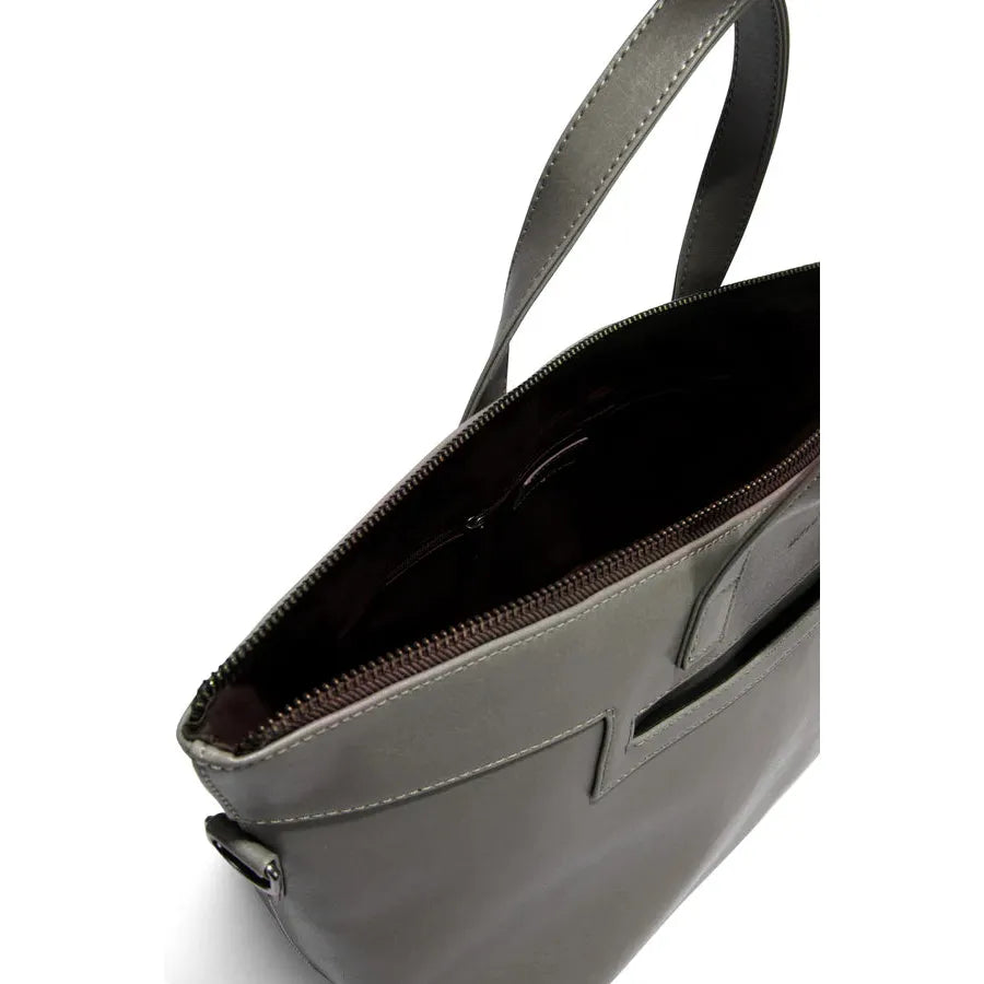 Tote with a top zipper closure, a slip pocket at the exterior front, interior pockets, handles to hand-carry, and a detachable and adjustable crossbody strap.